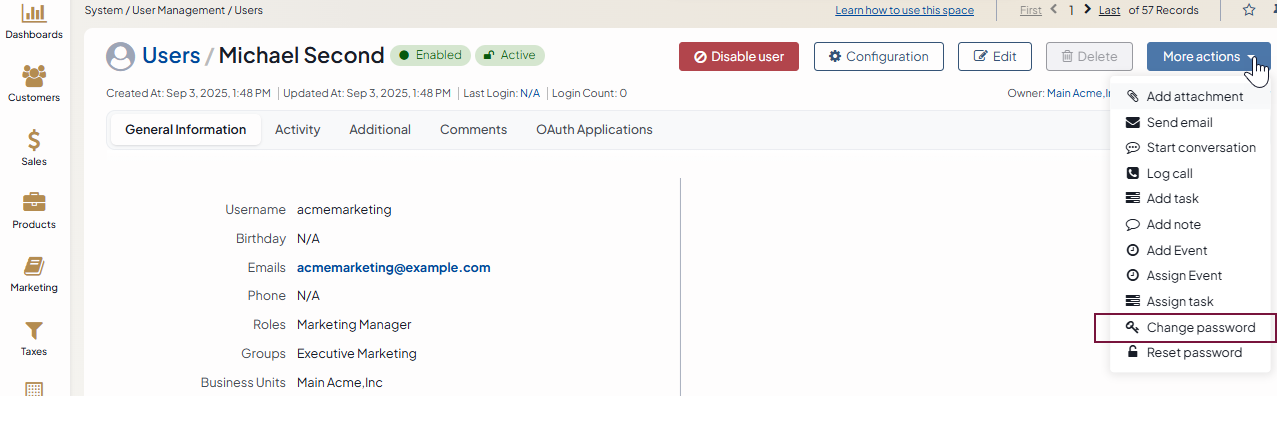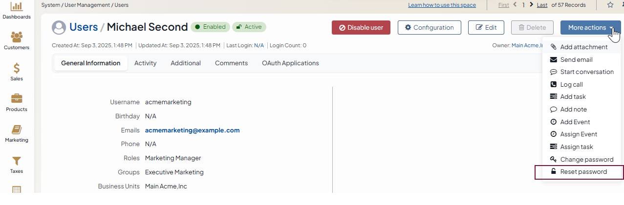 An administrator can request the customer user to change their password by clicking the More Actions menu on user profile page and selecting the Reset Password option: