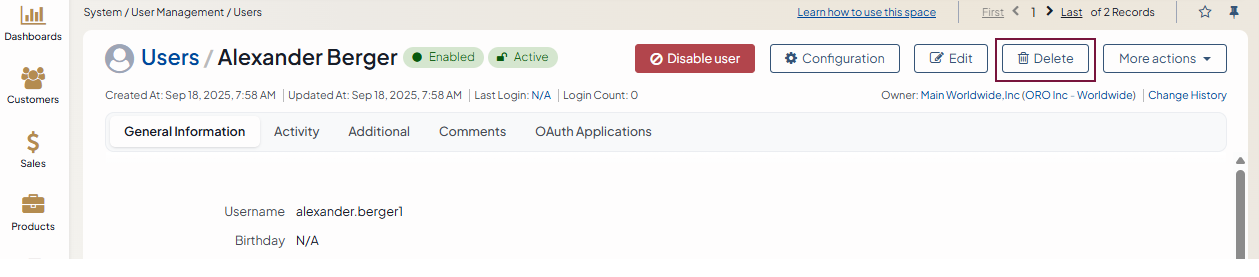 Alternatively, you can delete a user from their user page by clicking the Delete on the top right.