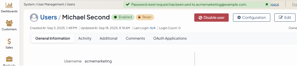 By clicking on the Reset button, a user will receive an email with a link to update their password. Users can only log into the application once their password is changed, in which case their password status changes to Reset in the back-office. The status switches to Active as soon as the customer user changes the password.