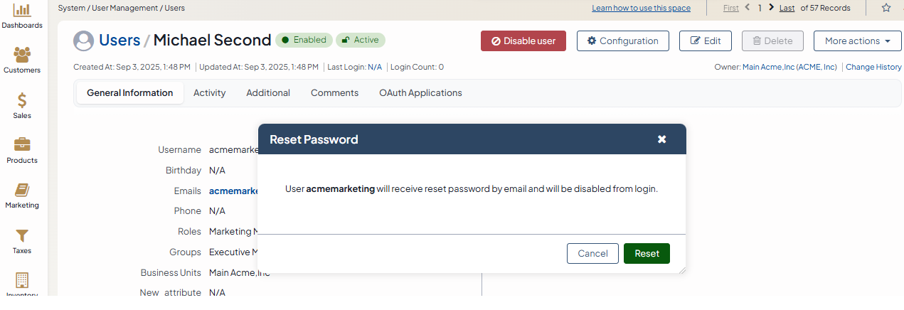 In the Reset Password dialog box, click Reset. The password reset links are sent to the primary email addresses of the selected users.