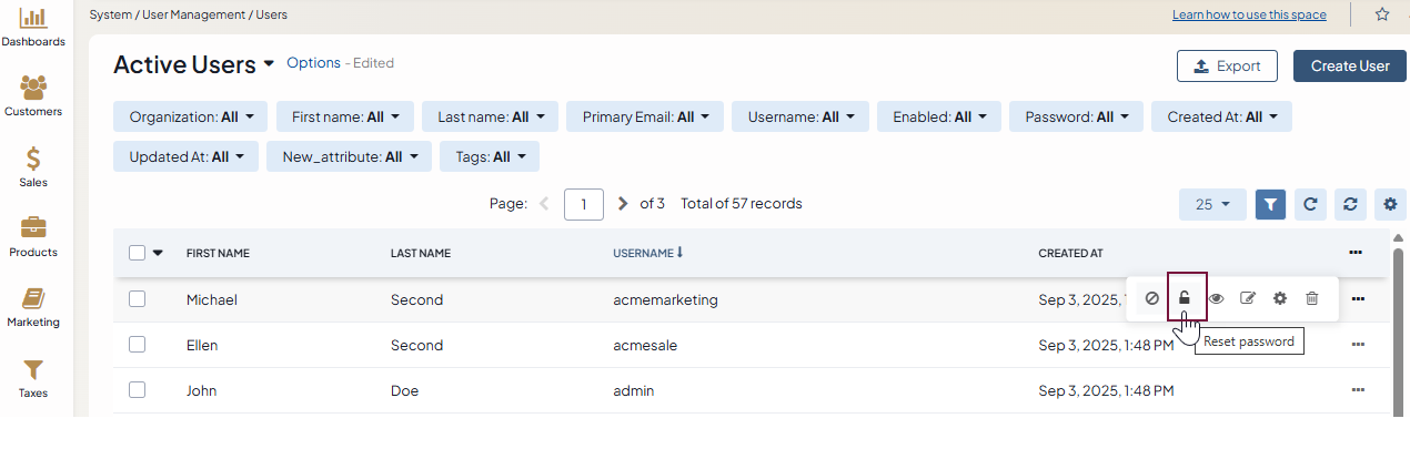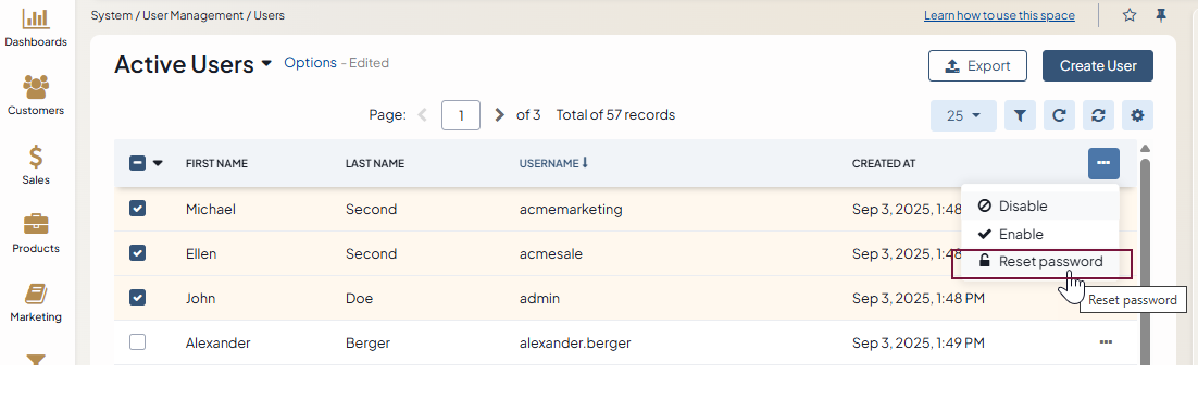 Alternatively, you can reset password for a specific user from the grid of all users. For this, hover over the ellipsis menu at the end of the row of the selected user, and click Reset Password.