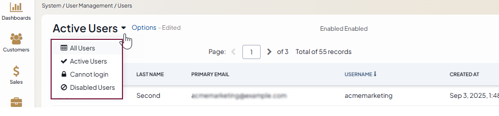 Keep in mind that besides the page with all users, you can get to the pages of only active or disabled users, or those who cannot log in.
