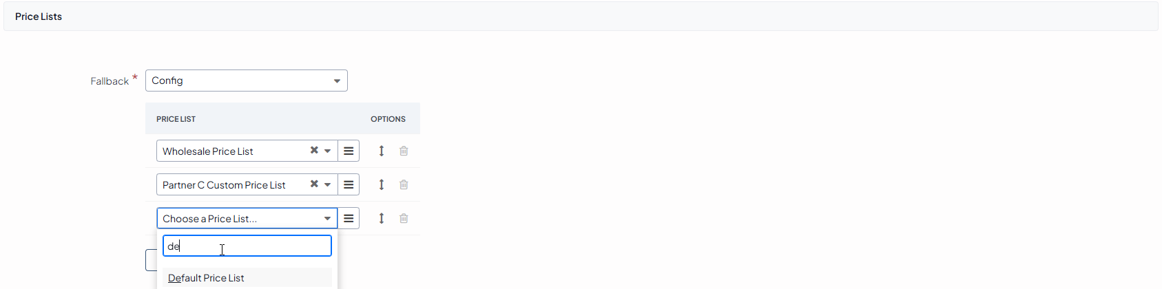 To change the price list priority, click and hold the Sort icon, and drag the price list up or down the list.