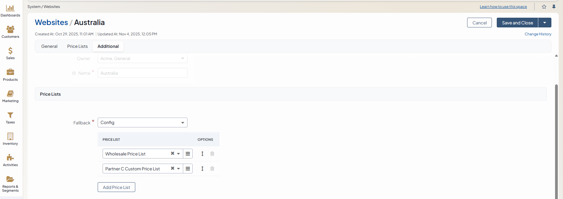 Configure Price Lists per Website