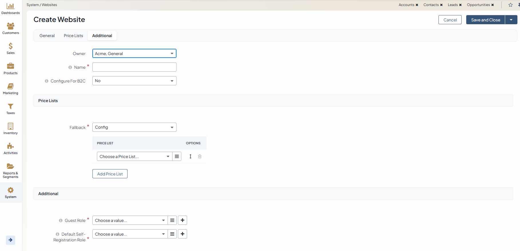 Price Lists — select the price list to use for this website. You may add multiple price lists using the + Add Price List option and specify the priority that controls the way the price is looked up.