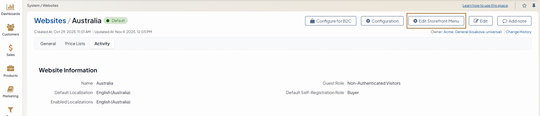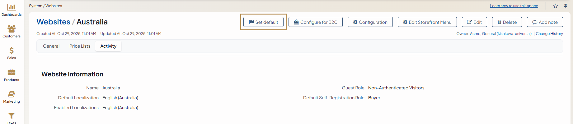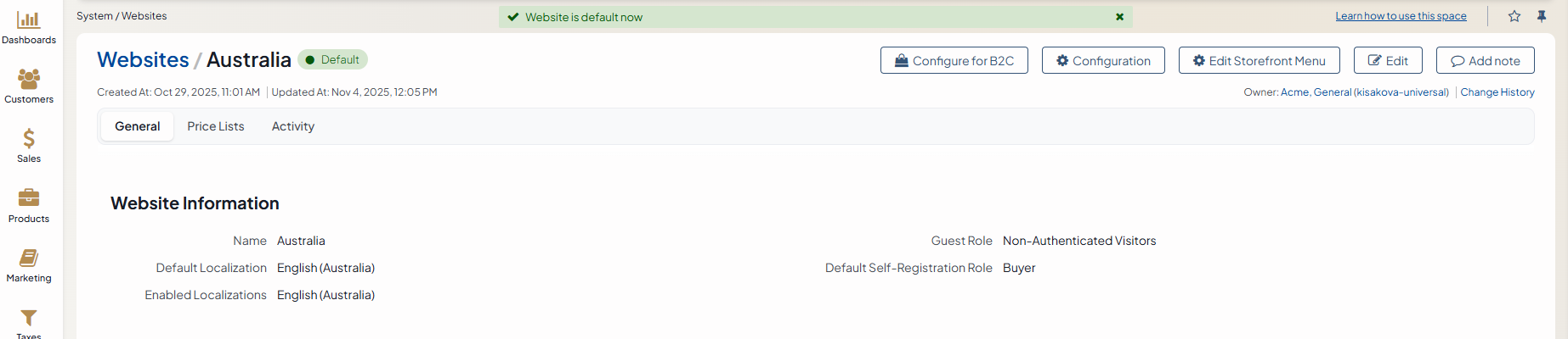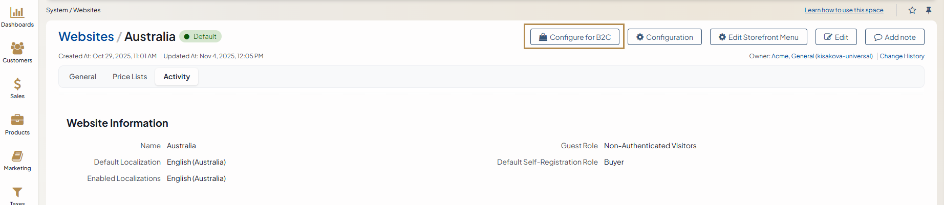 A B2C website can be configured in two ways, either during creation or from the website’s view page.
