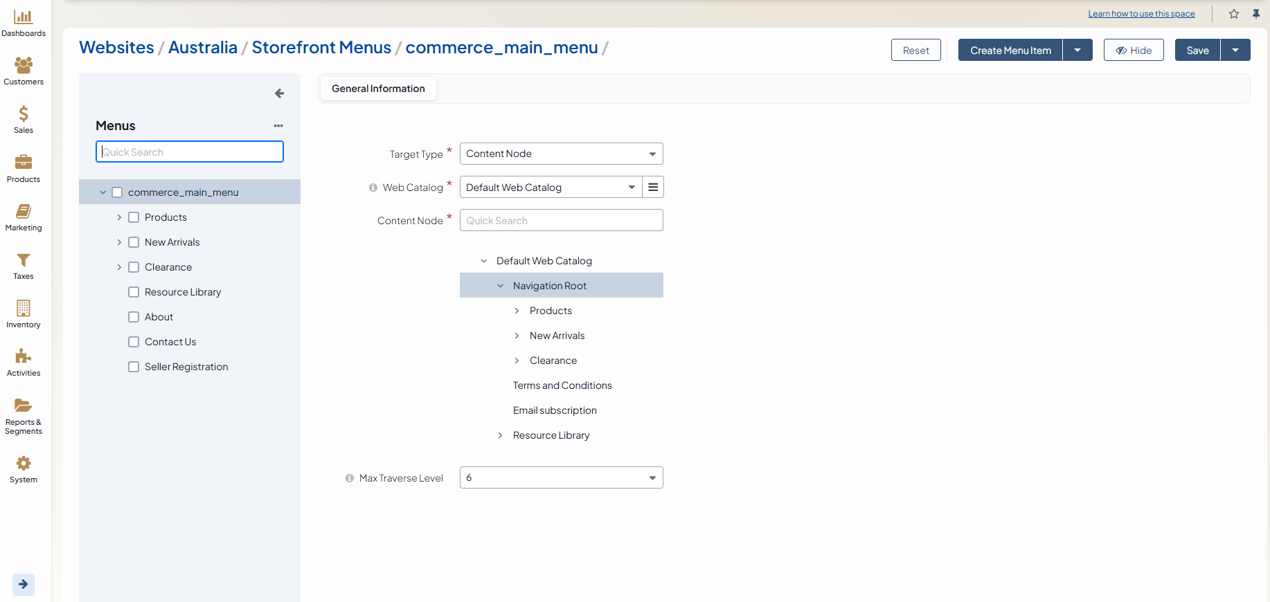 When you prepare web catalogs for you storefront, you can create and enable a custom web catalog for the website or set up a custom node content for the website in the default web catalog.