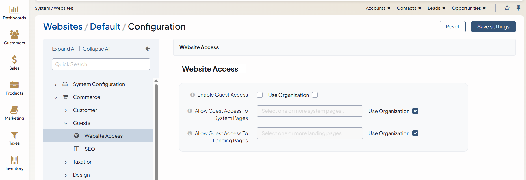 Select Commerce > Guests > Website Access in the menu on the left.