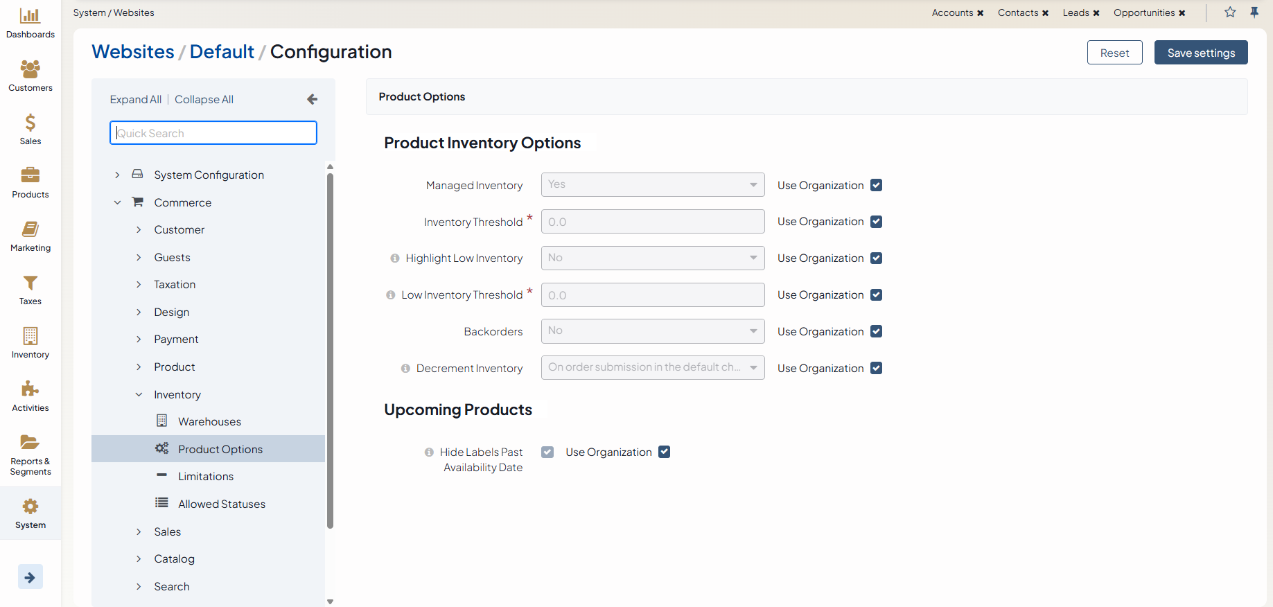 Here, you can manage both inventory and upcoming products options.