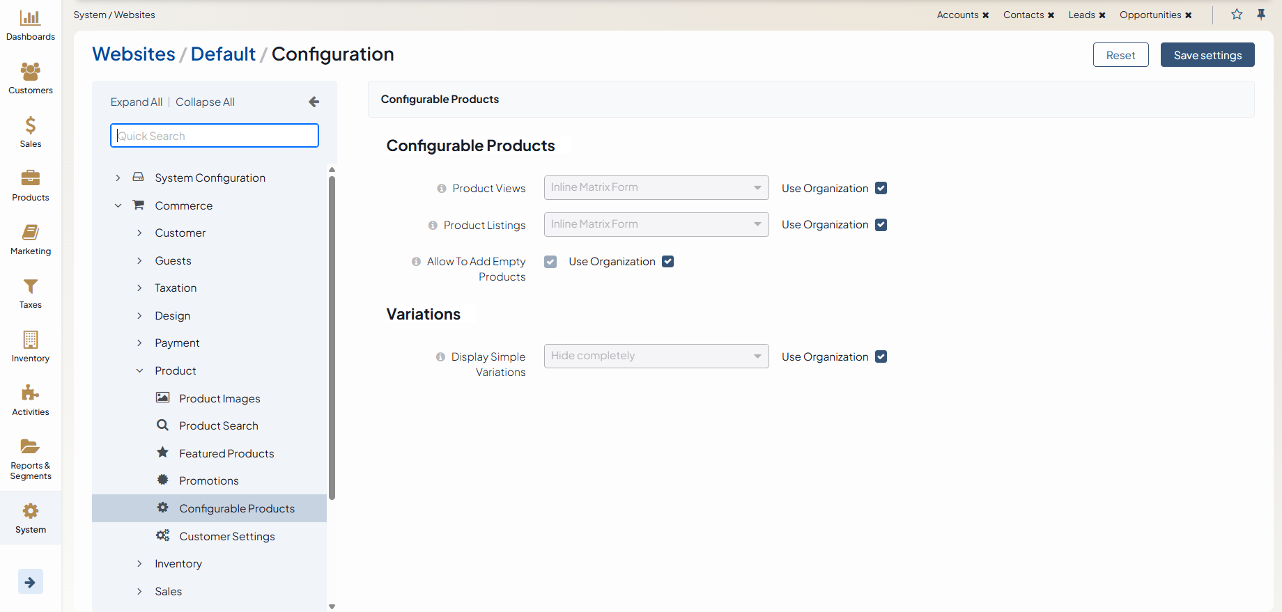 Allow To Add Empty Products — If enabled, a customer can add a configurable product with an empty matrix form to a shopping list to manage it later. To disable this possibility, clear the Use Organization checkbox next to the option and then the checkbox of the option itself.