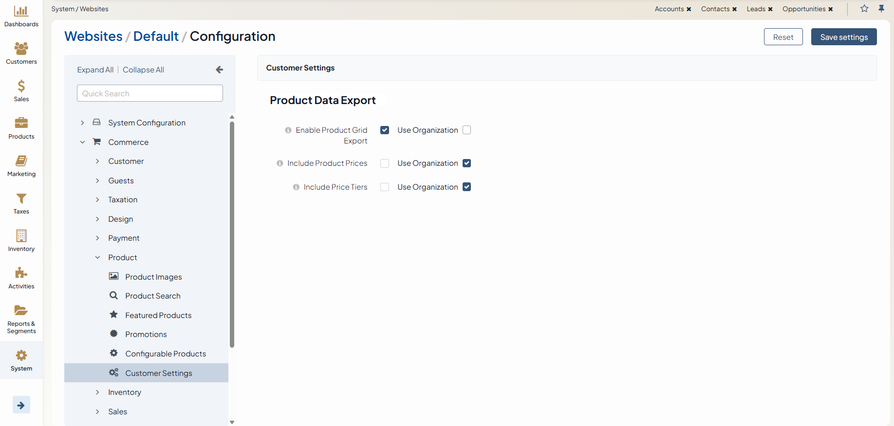 Configure Customer Settings for Product Data Export per Website