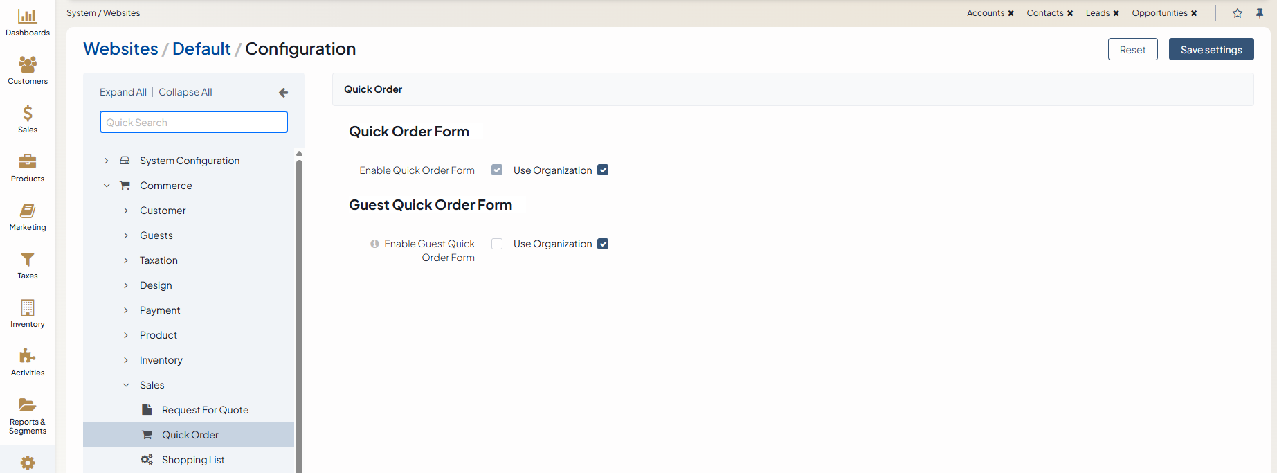 In the Guest Quick Order Form section, set whether guests are allowed to create a quick order form. By default, the guest quick order form is disabled.