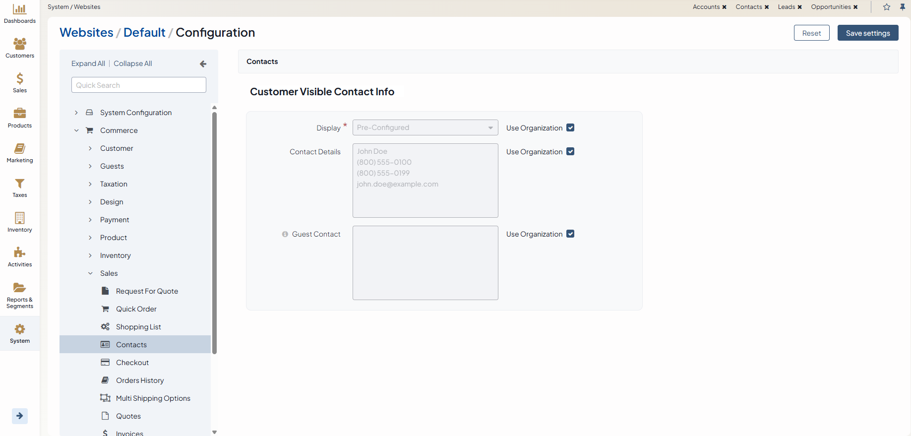 Configure Settings for Contacts per Website (Sales Rep Information)