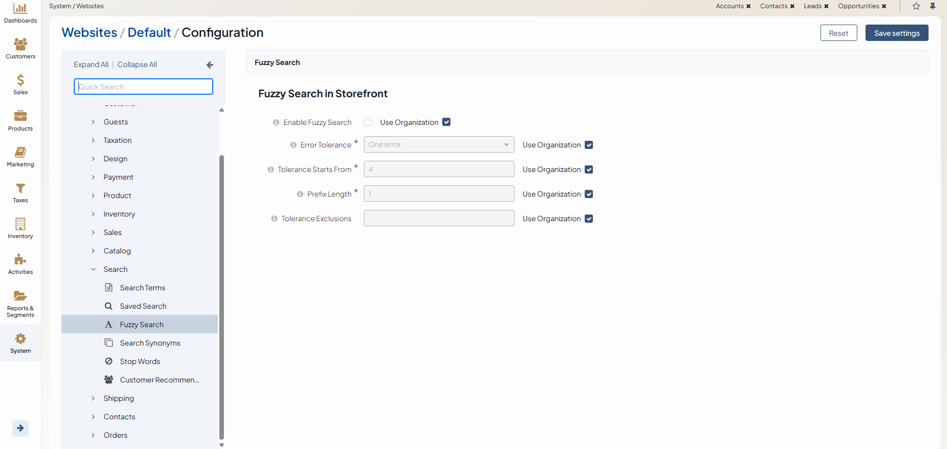 You can set up storefront error-tolerant (fuzzy) search in website search index requests to Elasticsearch. When enabled, it finds similar results for the passed request phrase word by word. Please be aware that this feature is not supported by the ORM search engine. For configuration options to set up fuzzy search in the back-office, see the General Setup Configuration topic.