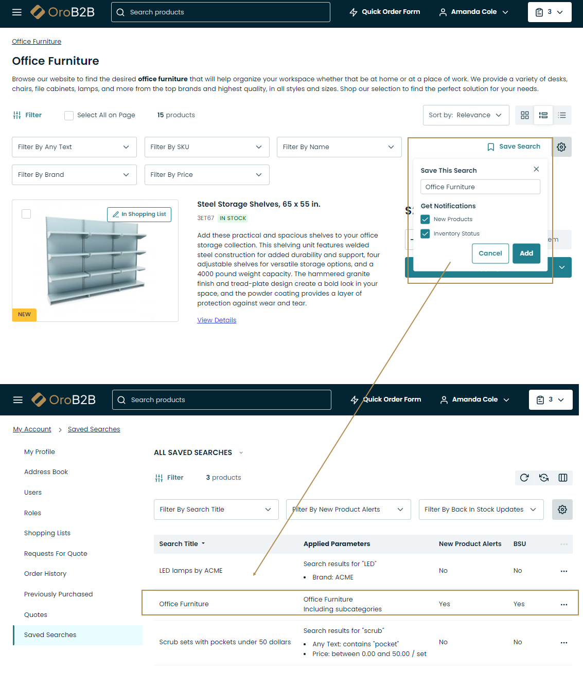 You can configure the ability for registered customer users to save search queries, return to these saved search queries later, receive notifications when a new product falls under the search conditions and when products from the search query result are back in stock.