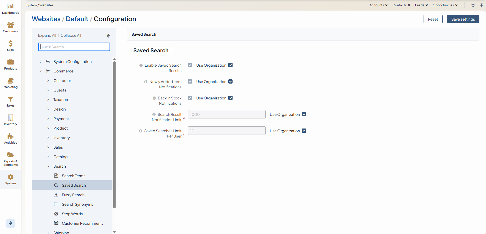 Configure Saved Search Settings per Website