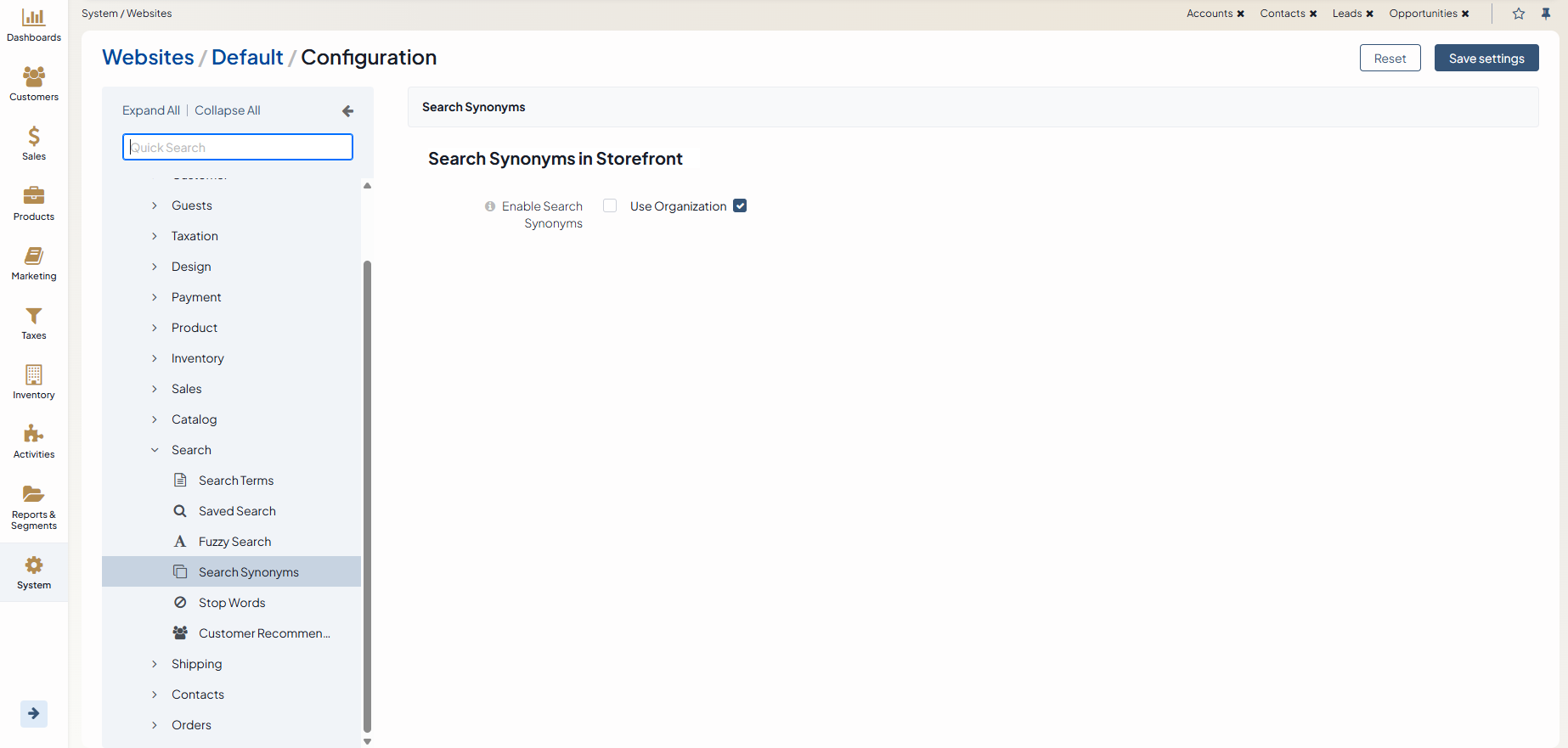 In OroCommerce Enterprise Edition, you can create a synonym group where a search for one word from this group in the OroCommerce storefront would return results for all the synonyms in this group. Synonym management is enabled globally and per website in the system configuration, and subsequently managed through Marketing > Search > Search Synonyms in the main menu.