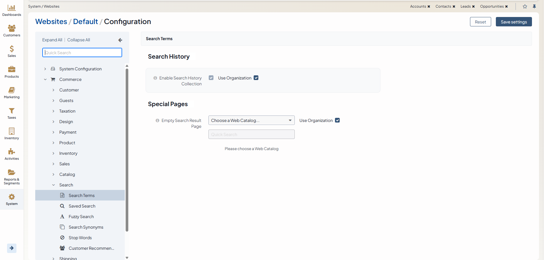 You can configure search history globally, per organization, customer group, or customer, and empty search results page globally, per organization, and website.