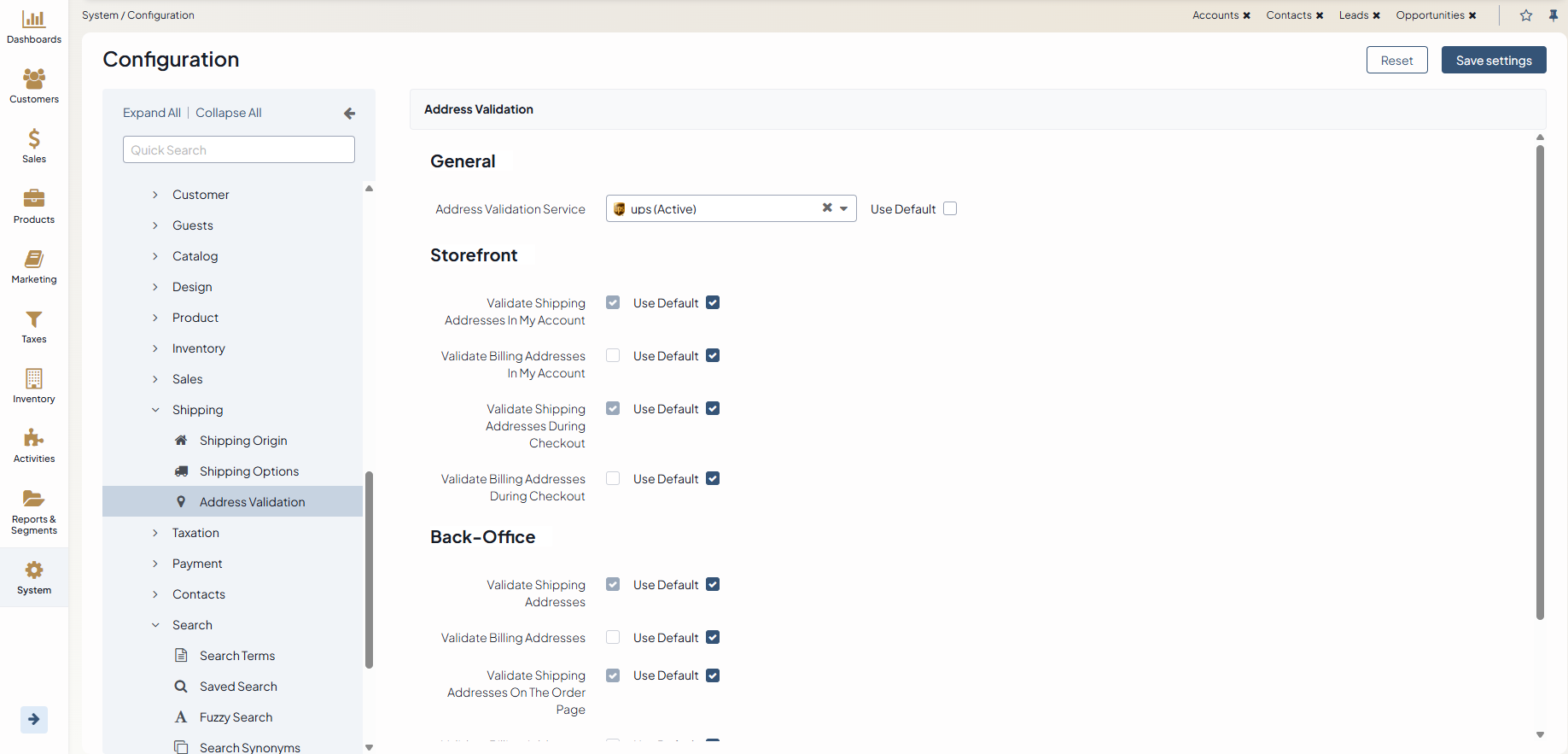 The Address Validation feature can be configured on the global, organization, and website levels.