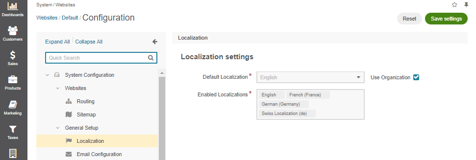 Select System Configuration > General Setup > Localization in the menu to the left.