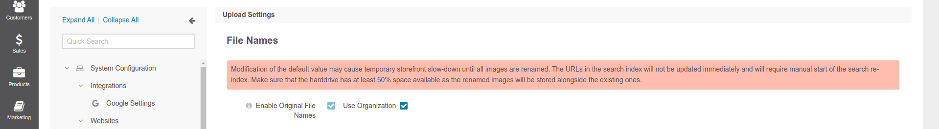 When this option is enabled, the Enable Original File Names setting for Product Images is hidden from the system configuration page.