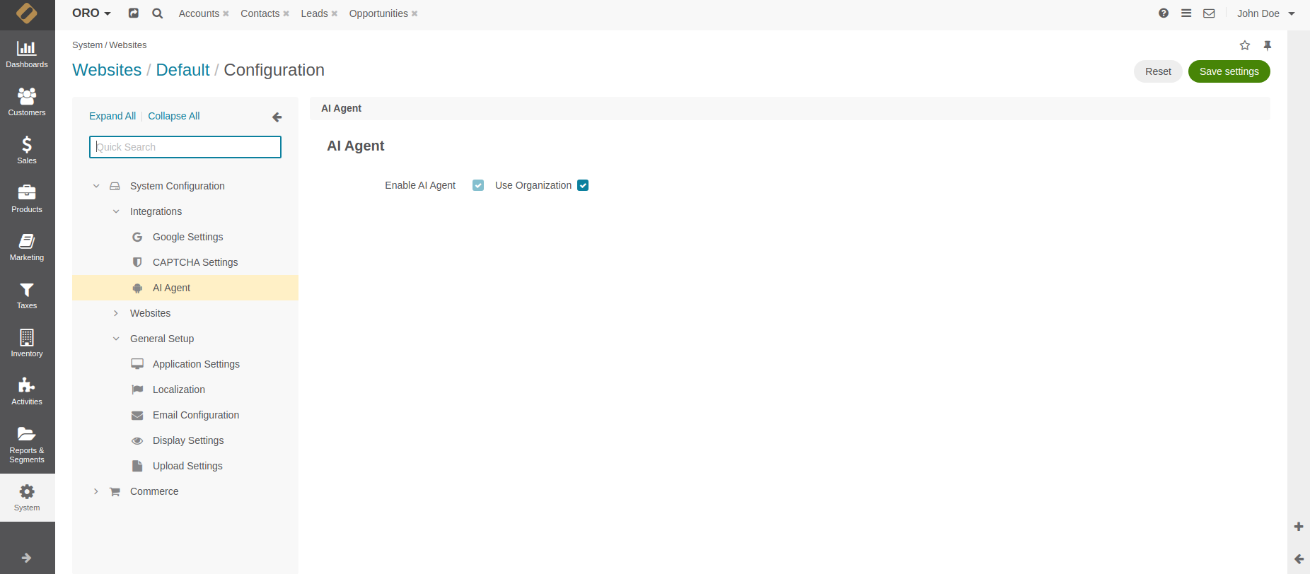 Once the agent is installed in the Oro application, you can enable it in the system configuration globally, per organization, website, customer and customer group: