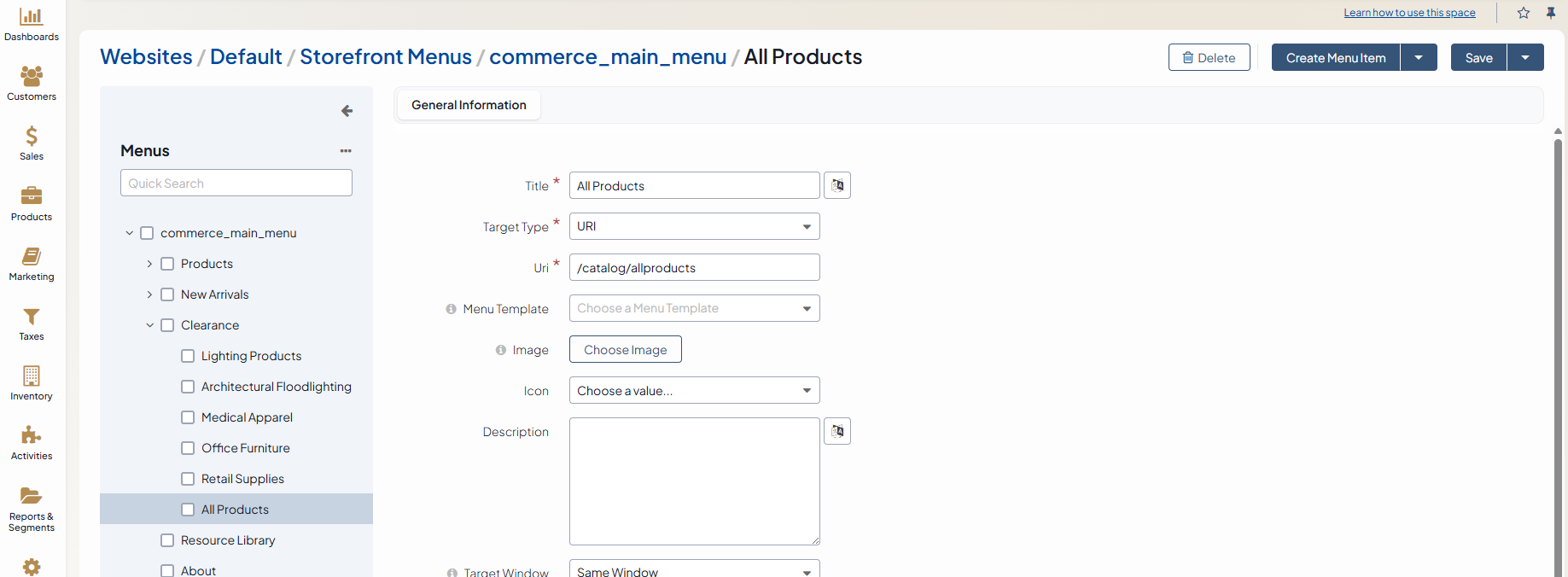 5. Click Create Menu Item on the top right of the page.