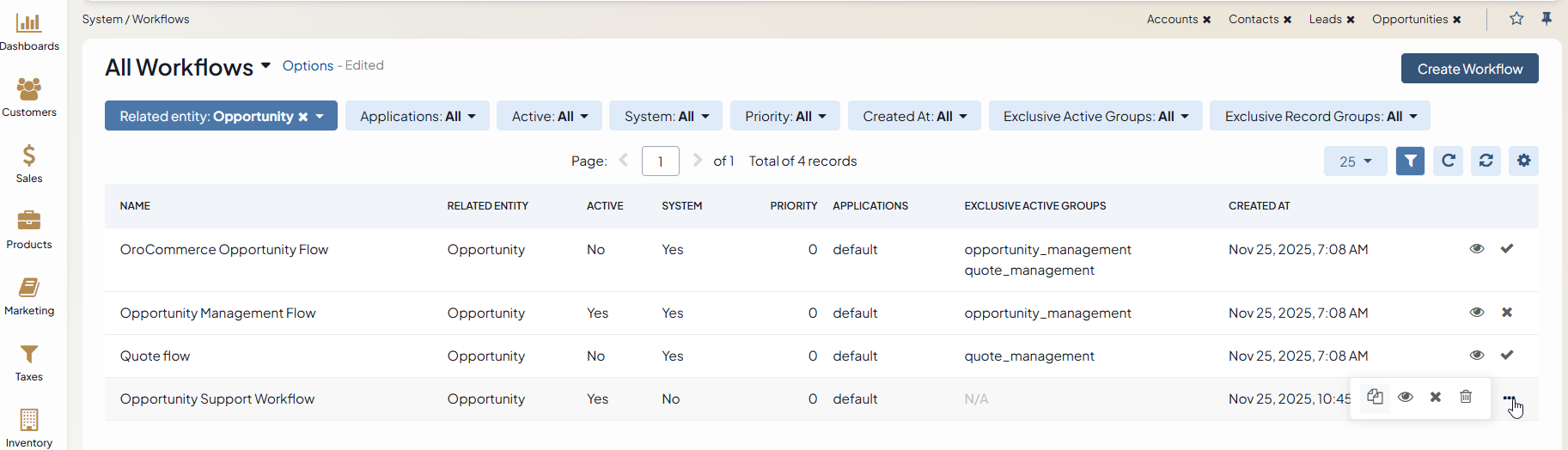 Workflows created on the UI from scratch are custom workflows. Navigate to System > Workflows in the main menu to reach the page with all custom and system workflows. You can perform the following actions for them: