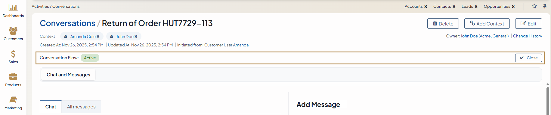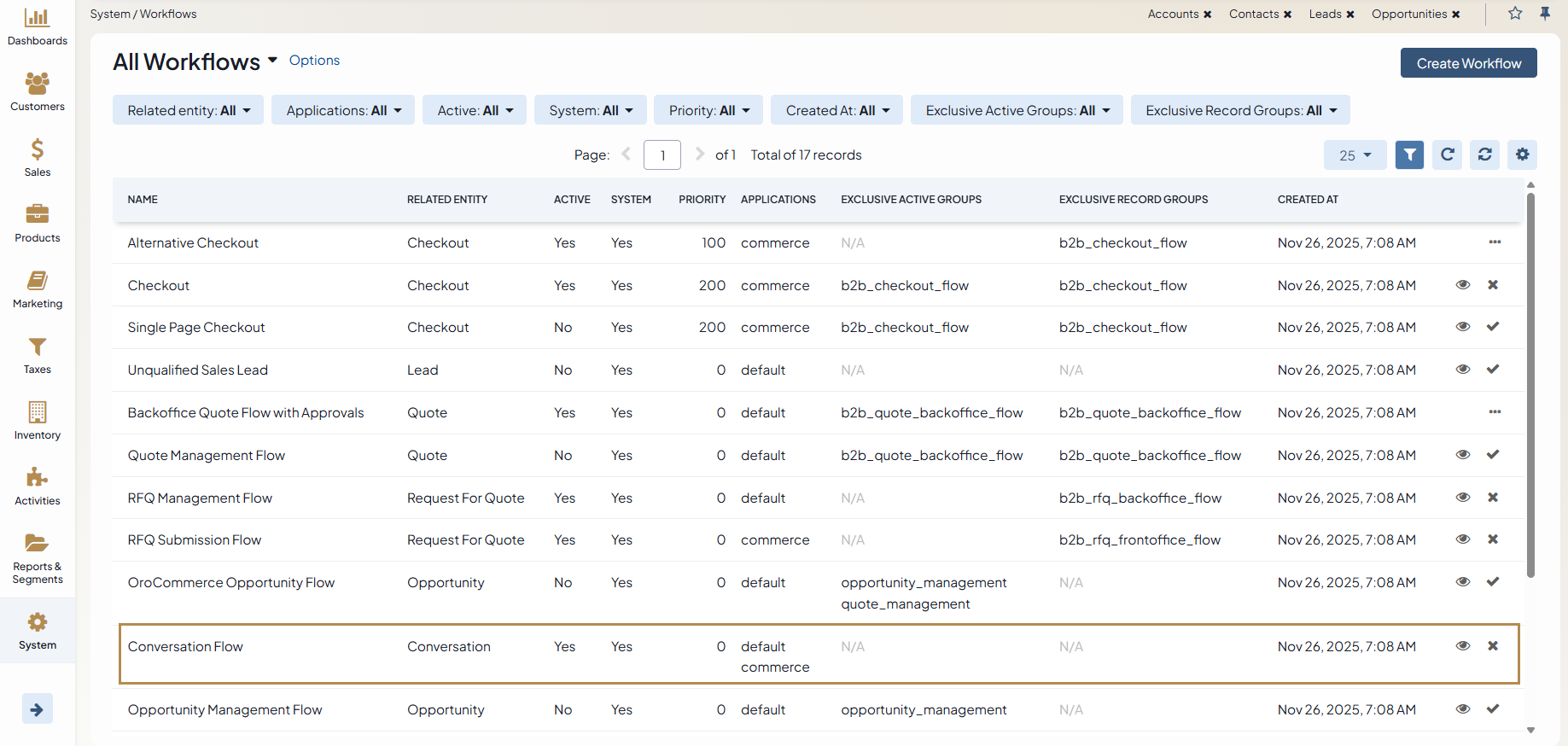 Oro offers a conversation feature for easy communication between back-office and storefront users. Conversations allow back-office staff to share information and communicate with other back-office users or customer users in the storefront. The Conversations Workflow is a system workflow that provides the following default statuses for the conversation feature: Active, Inactive, Closed.