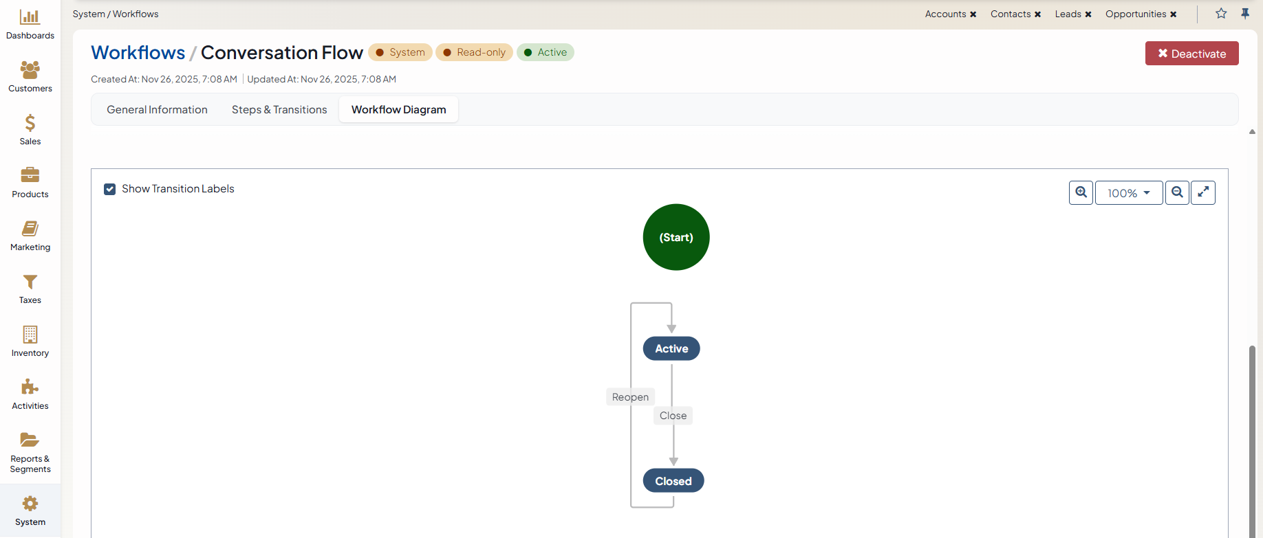 By default, the Conversation workflow is active. On its view page, you have an option to disable the workflow by clicking Deactivate on the top right. As it is a system workflow, it cannot be edited or deleted.