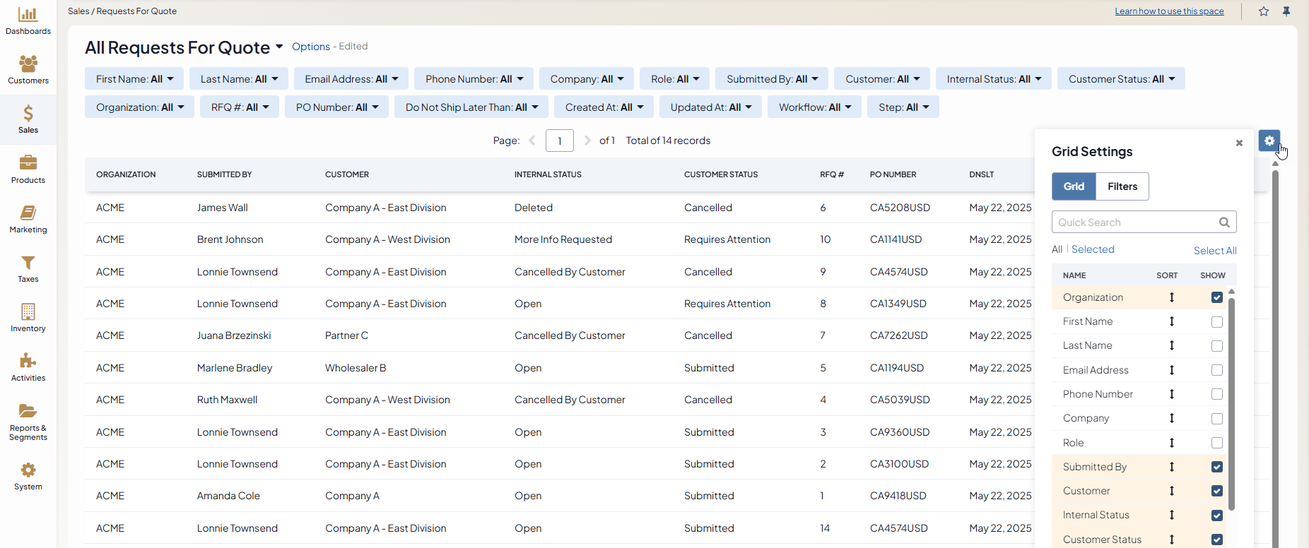 Customer Statuses (correspond to RFQ Submission Flow on the RFQ page) are described in RFQ Submission Flow.