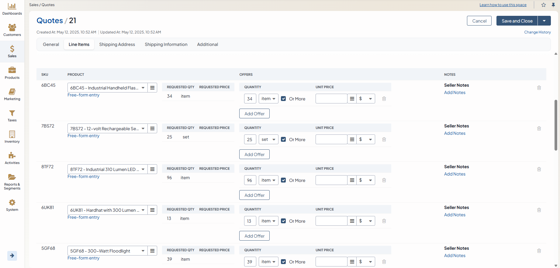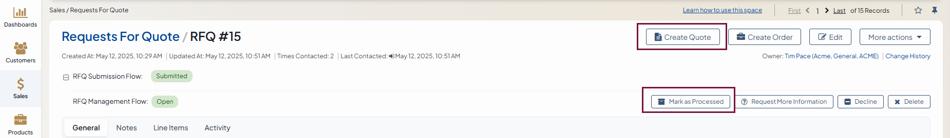 More information has been provided, the sales person marks the RFQ processed and creates a quote straight from the RFQ view page.