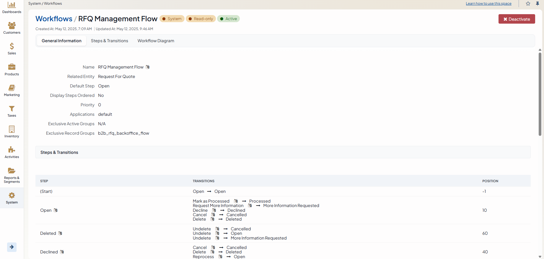 On the RFQ Management Flow page, you can disable the workflow by clicking Deactivate the workflow.