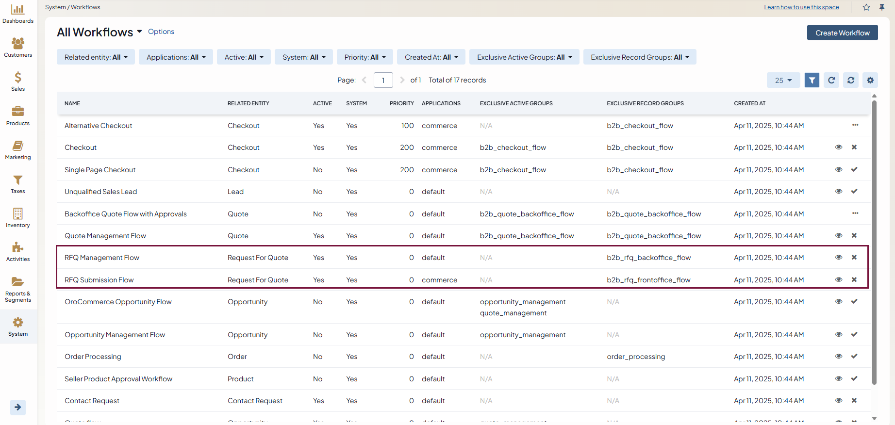 Within the Workflows list, you can perform the following actions for the RFQ Management Flow workflow: