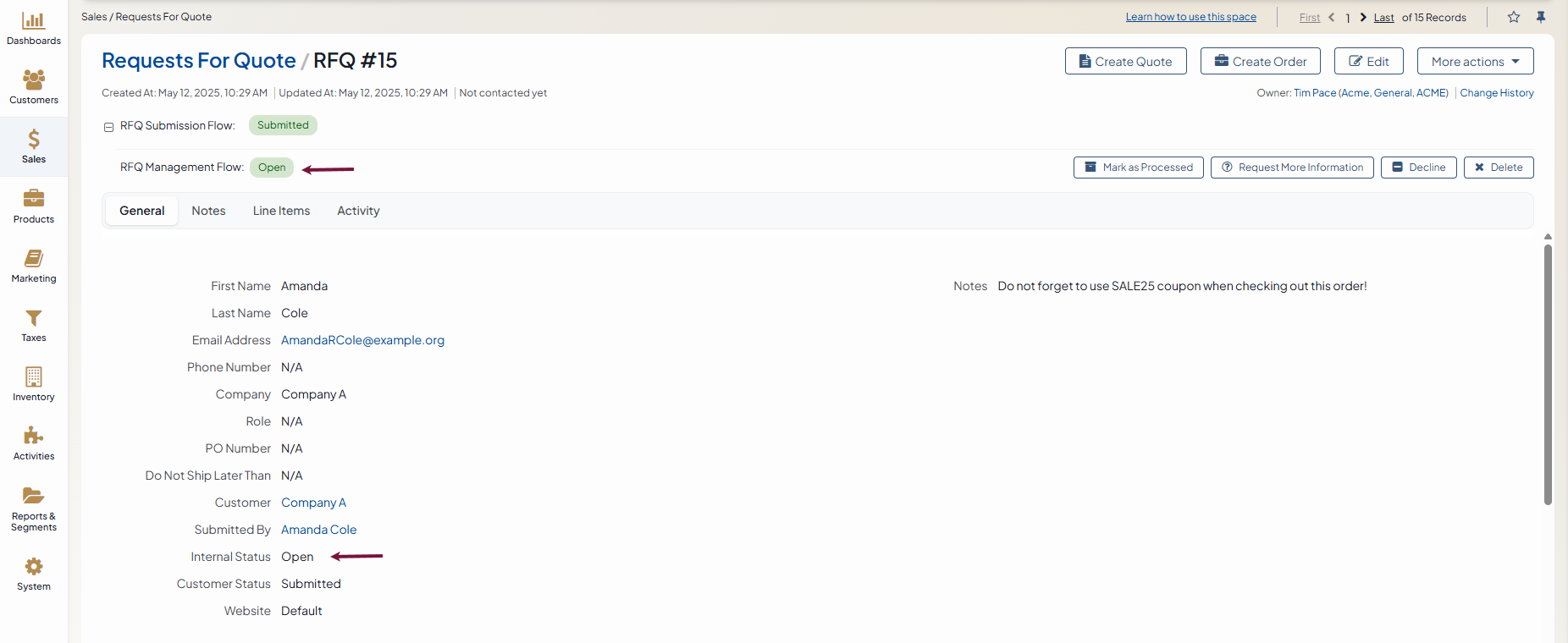 Once an RFQ is received, it is automatically moved to the Open step with a possibility to mark this request processed, request more information, decline or delete it.