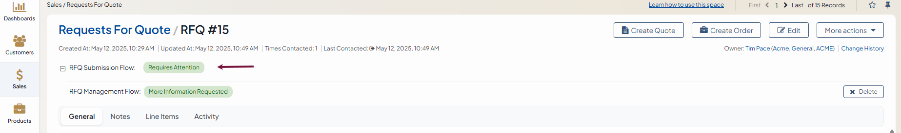 More information has been requested, the RFQ is now in the More Information requested step with Requires Attention customer status. The only transition available in this step is Delete.