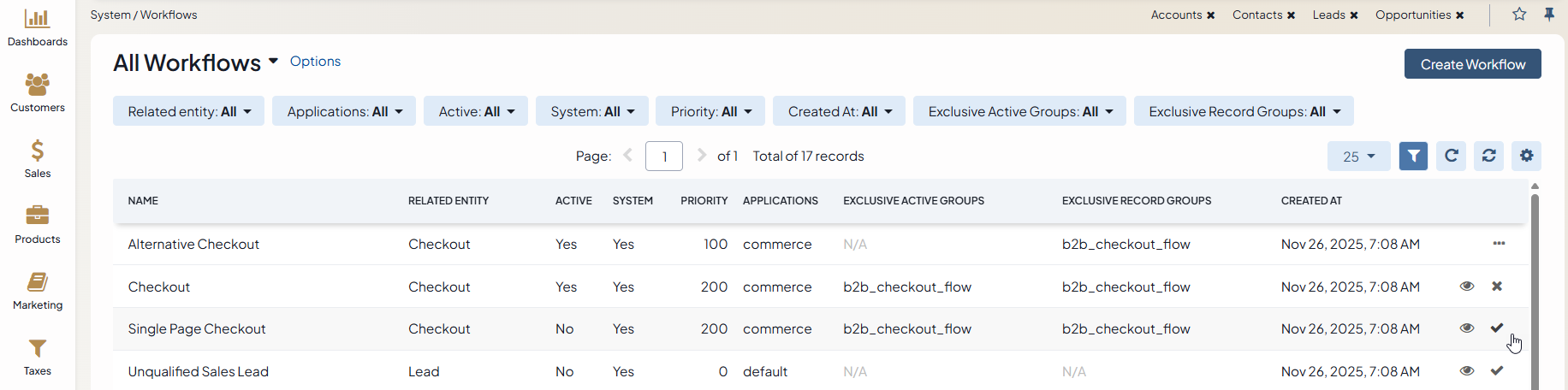 Within the list of workflows, you can perform the following actions for the Single Page Checkout workflow: