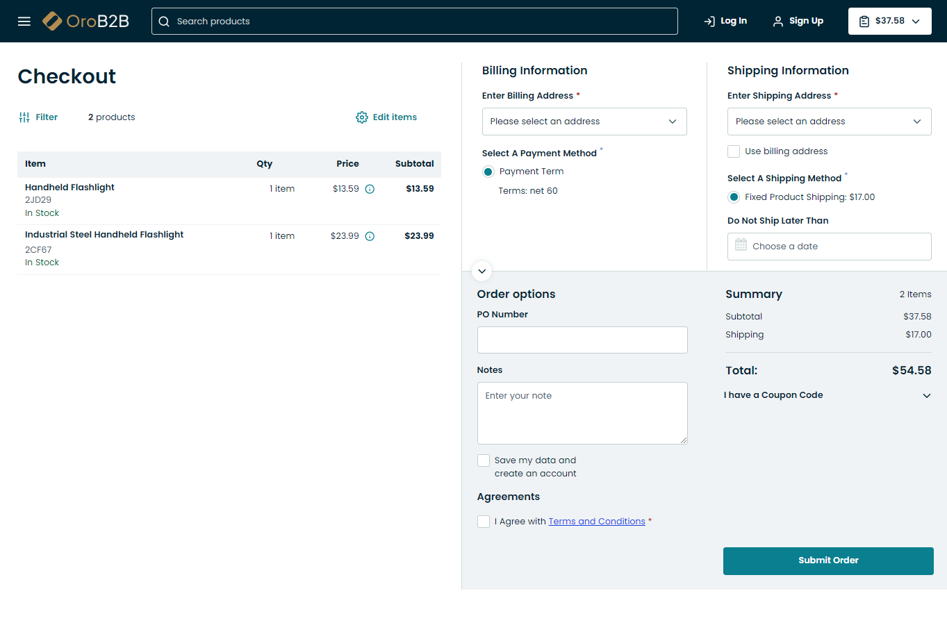 In your Oro application, you can control the way the checkout is displayed to customers in the storefront. By default, each checkout step is displayed on a new page. However, by activating the Single Page Checkout workflow in the back-office, you can make all steps fit one page. This will make the checkout process easier and quicker for customers, since they will be able to see how far along in the checkout they are, and how many fields are left to complete it.