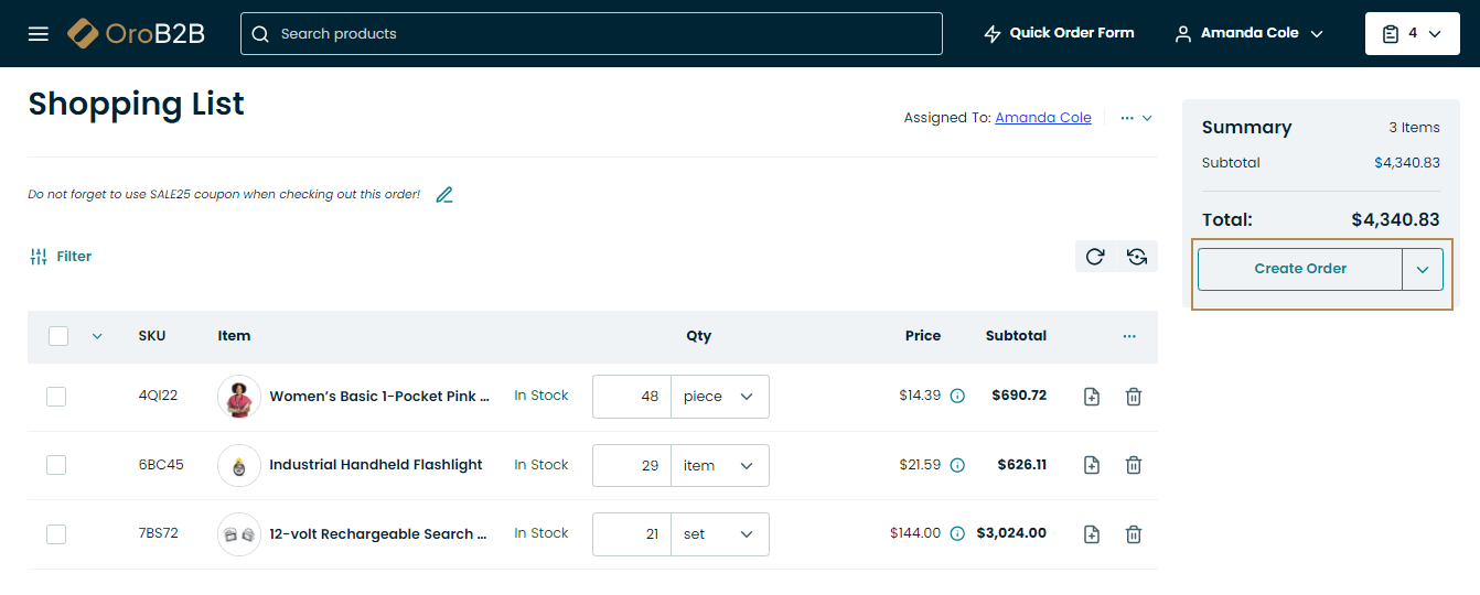 Review the order by checking items, SKUs, item quantity, price and the subtotal amount.