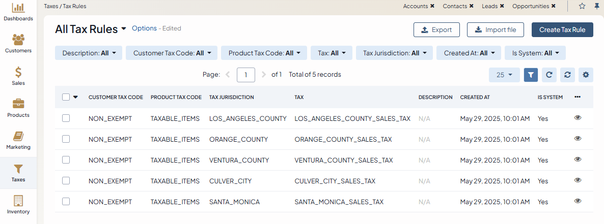 Finally, create a tax rule that associates the customer tax code, the product tax code, and the tax jurisdiction with the tax rate or the tax exemption (zero rate).