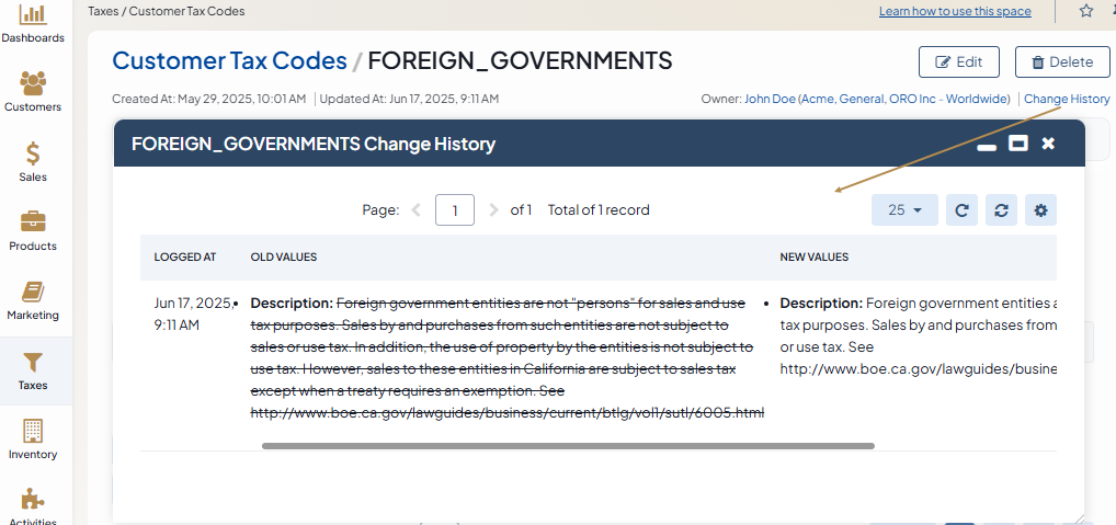 View Change History — See the log of edits of this customer tax code by clicking the Change History link to the top right of the page.