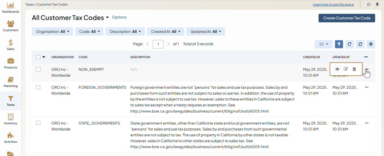 Hover over the More Options menu to the right of the item and click to open its details page, to edit, or to remove the customer tax code.