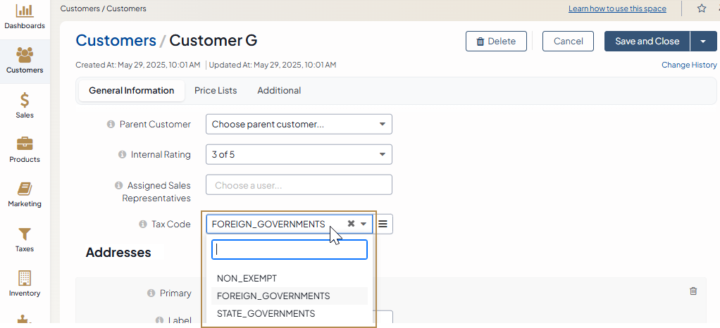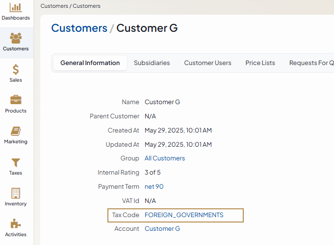 The sections below explain how to manage customer tax codes, using them to label customers and bind customers to dedicated tax rules.