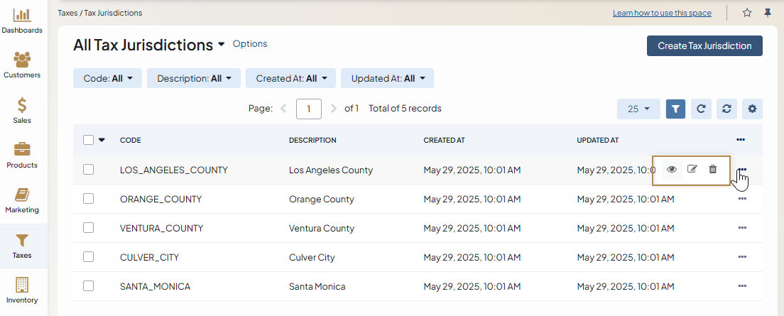 In the tax jurisdictions list, you will find the information about the code (unique identifier), detailed description, and the dates when the tax jurisdiction was created and updated.