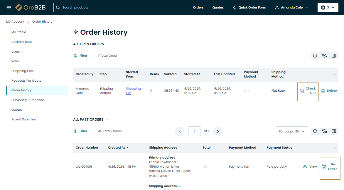 All information about ongoing checkouts is compiled and stored under the Order History section of your Account menu. Keep in mind that only registered users have access to the menu and are able to trace the checkout progress of both their own checkouts and the checkouts initiated by other users from their organization (provided that the permission to do so is added to the customer user’s role).