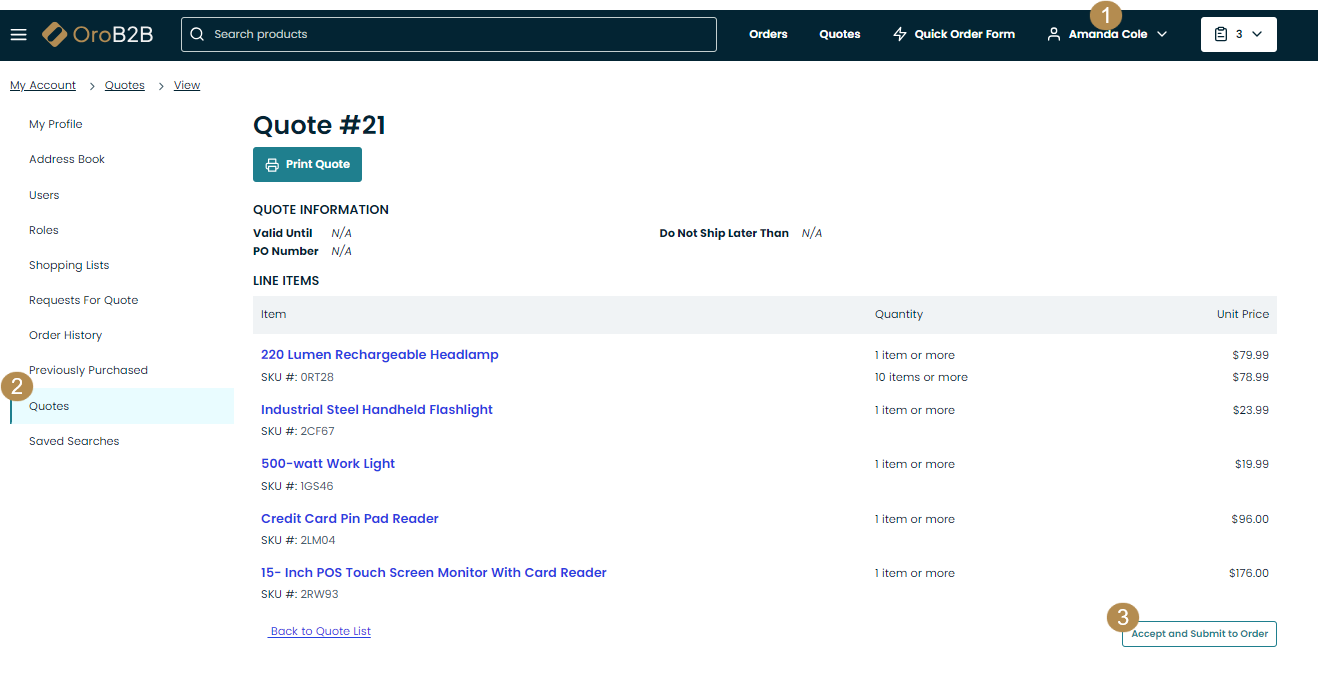 All received quotes are stored under the Quotes section of the My Account menu. When you create an order from the quote, you accept the information provided by a sales rep. The information cannot be changed. So, if a sales rep inputs any data themselves (e.g., billing or shipping address, shipping or payment method, or any other extra costs), the preset values are applied at checkout automatically. You are only allowed to view and double-check the data.
