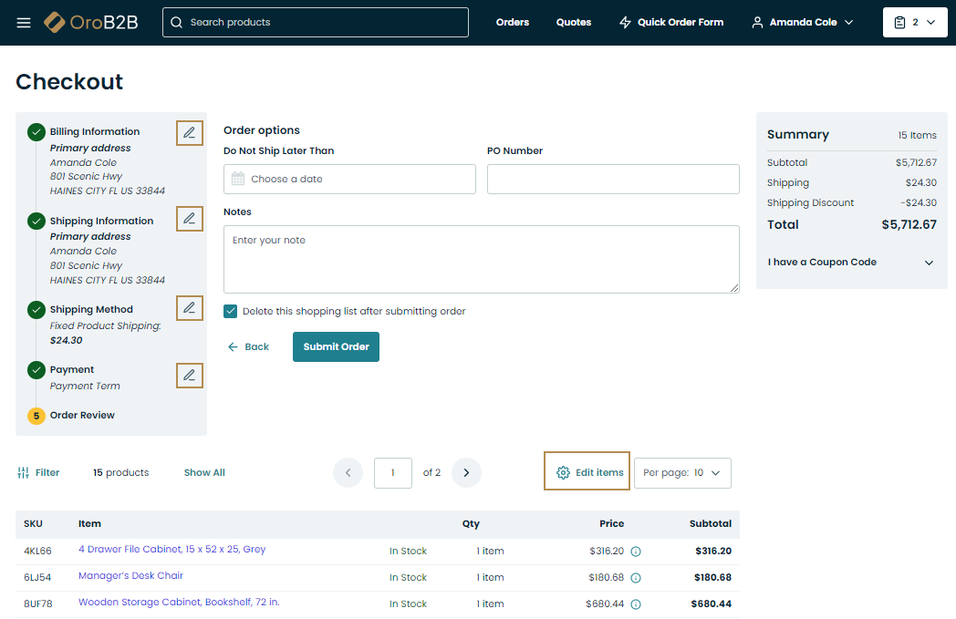 Order Review — The final step before submitting the order. At this step, a customer is supposed to check the order, review all the items and quantities, prices and subtotals, check the calculated taxes that are to be applied to the order, add a promotion coupon if any, or provide some comments to the sales manager. The customer can also modify the items by clicking on the right and returning to the checkout source page (a shopping list, quote, or an order), edit the required product information, and get back to the step they have left. However, if certain conditions are not satisfied due to new product adjustments (shipping or payment method is changed), the customer will be redirected to that specific step.