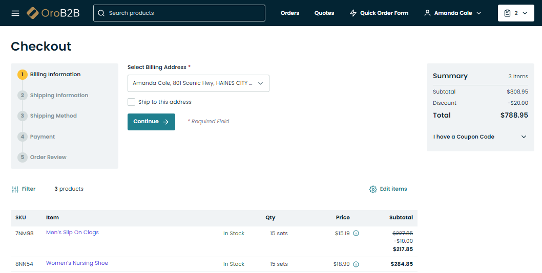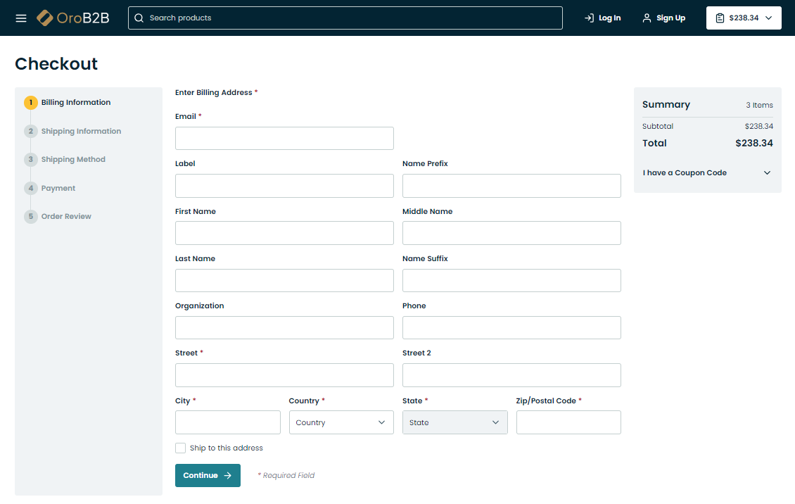 As the terms imply, your OroCommerce checkout pages can be configured either as a one-page solution or as a step-by-step process, whichever best suits your sales strategy.
