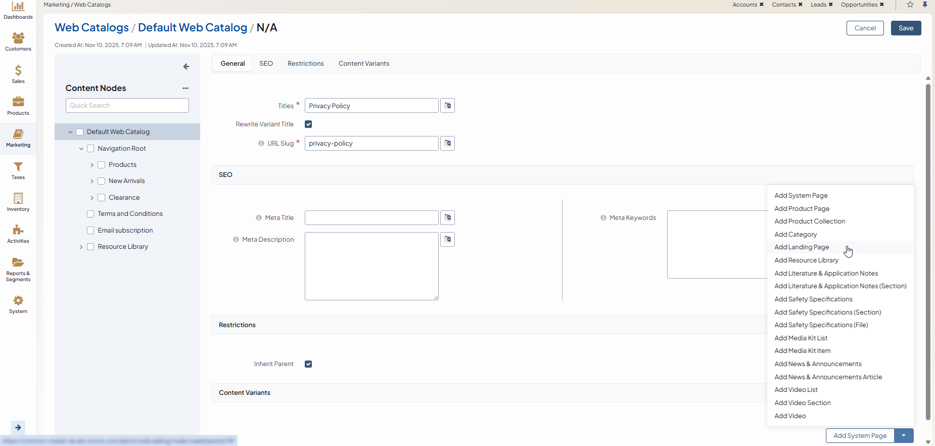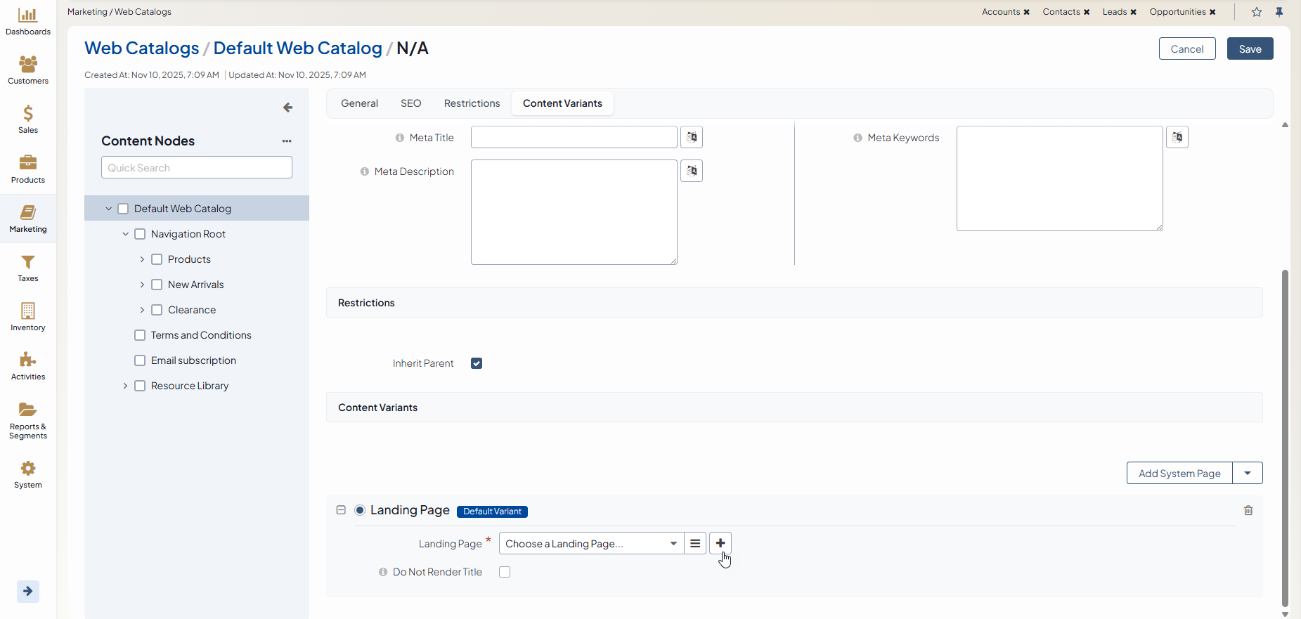 Navigate to Marketing > Web Catalogs in the main menu.