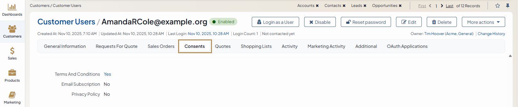 You can view all consents accepted by your customer users in the Consents section of their pages under Customers > Customer Users.